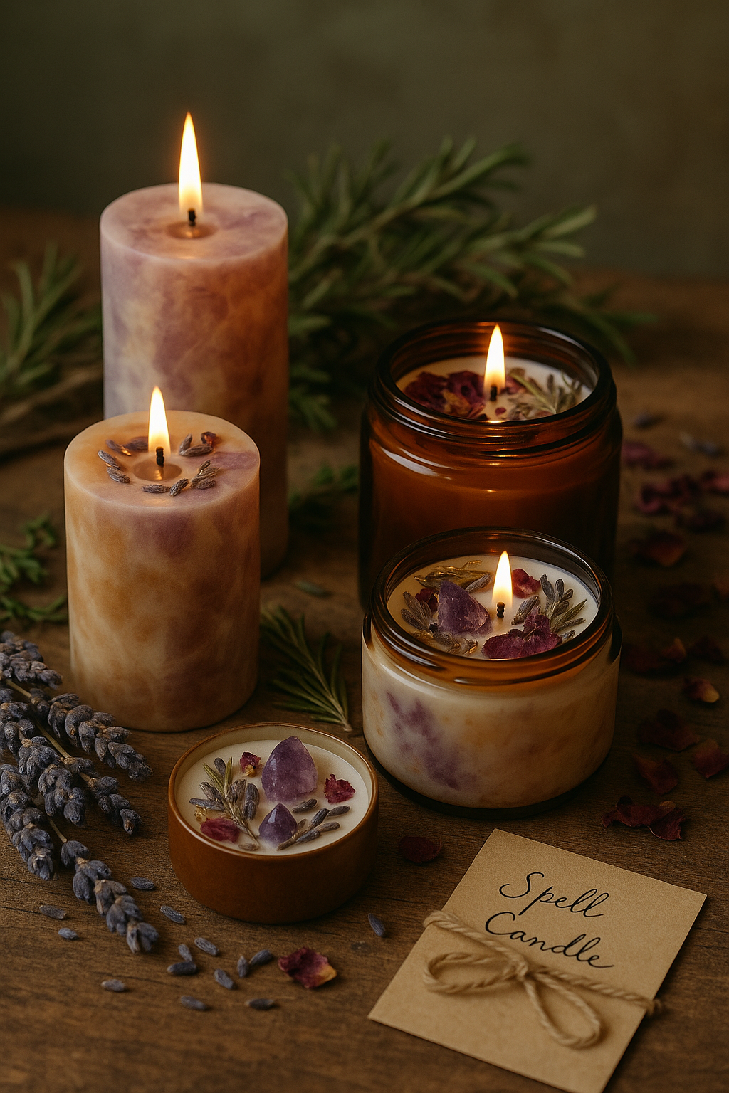 Featuring botanicals that match the candle’s intention—like lavender for calm, rosemary for protection, or chamomile for peace.